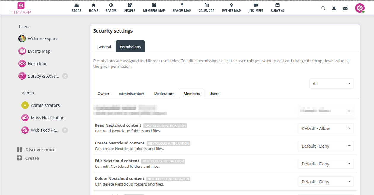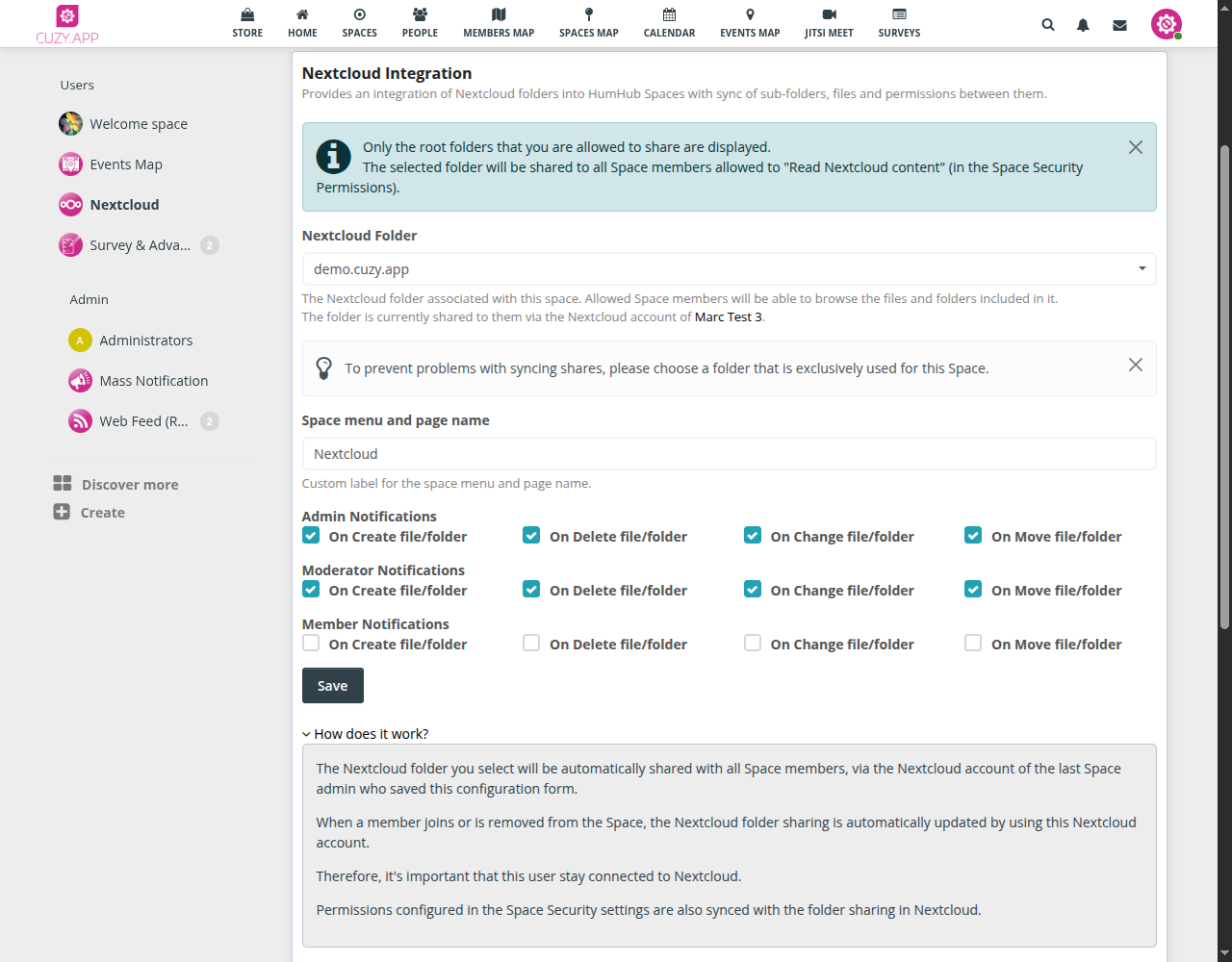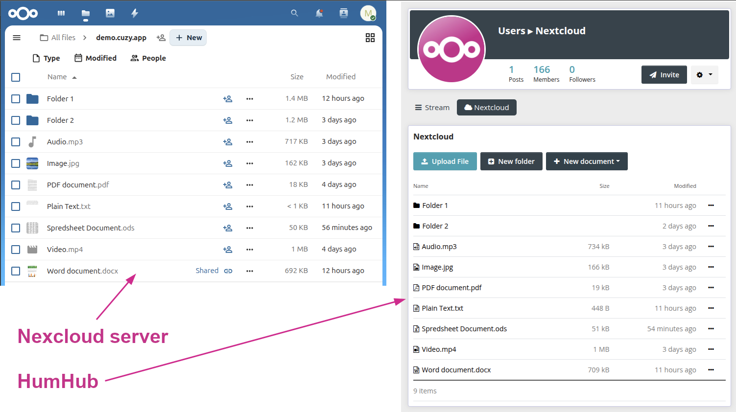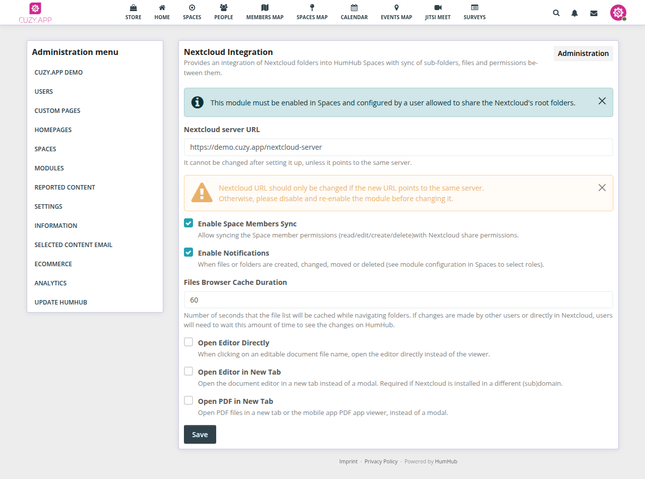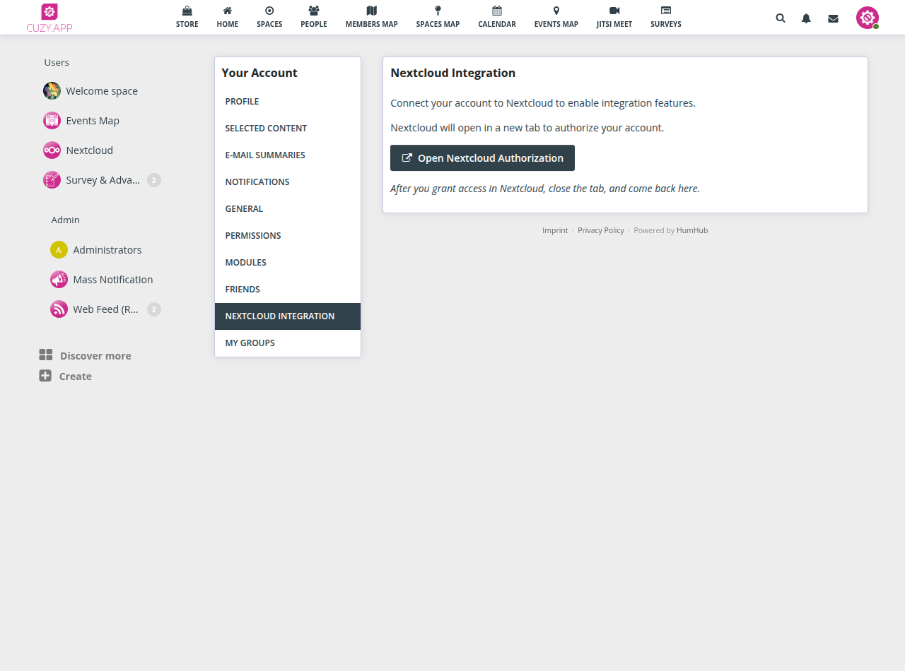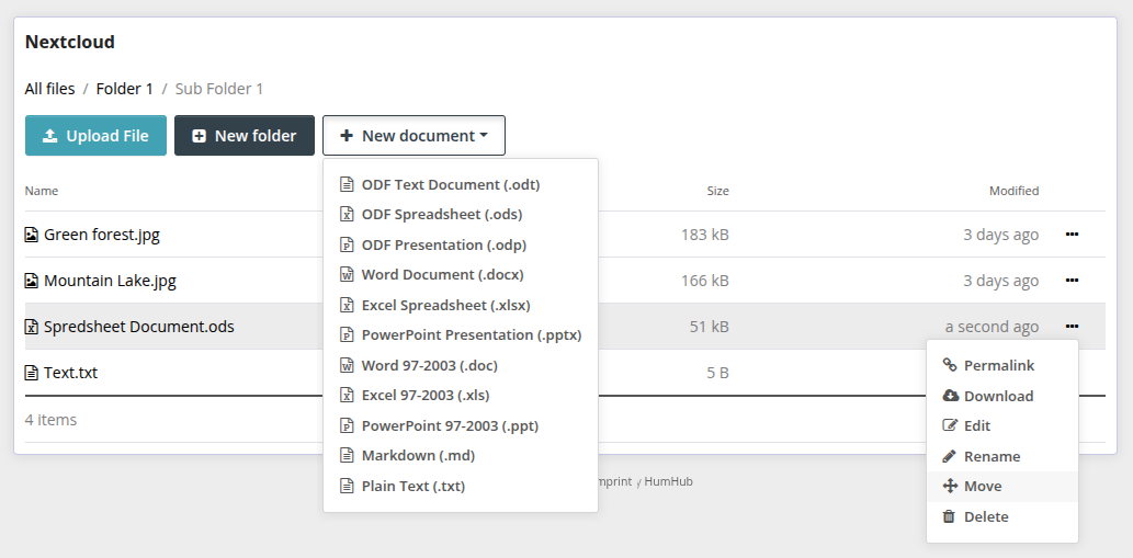 Provides an integration of Nextcloud folders into HumHub Spaces with sync of sub-folders, files and permissions between them.